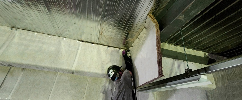 裁断した耐火材料を専用機器を使って鉄骨やコンクリートに巻き付けます。